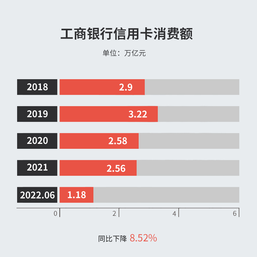 2022年上半年,工商银行信用卡消费额 1.18万亿元,同比下降8.52%;