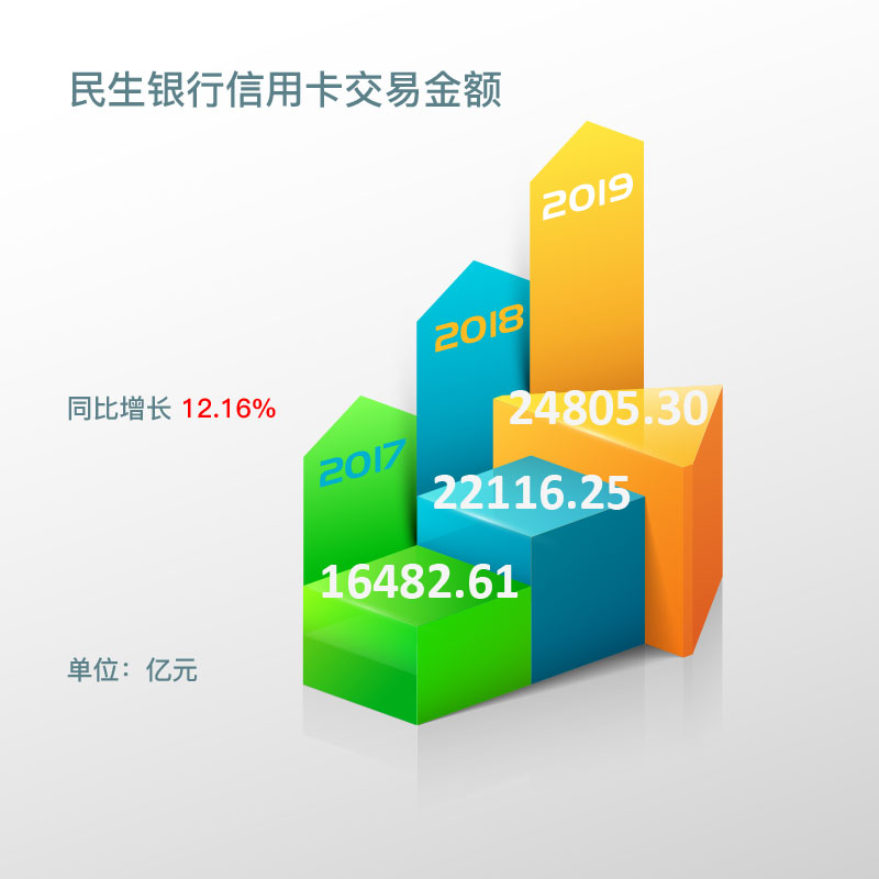 报告期内,民生银行信用卡实现交易金额24,805.3亿元,同比增长12.16%。2018年民生银行信用卡实现交易金额22,116.25亿元,2017年民生银行信用卡实现交易金额16,482.61亿元。