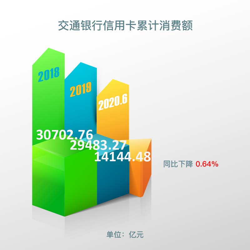 报告期内,交通银行信用卡累计消费额14,144.48亿元,同比下降0.64%,2019年交通银行信用卡累计消费额29,483.27亿元,2018年交通银行信用卡累计消费额30,702.76亿元。