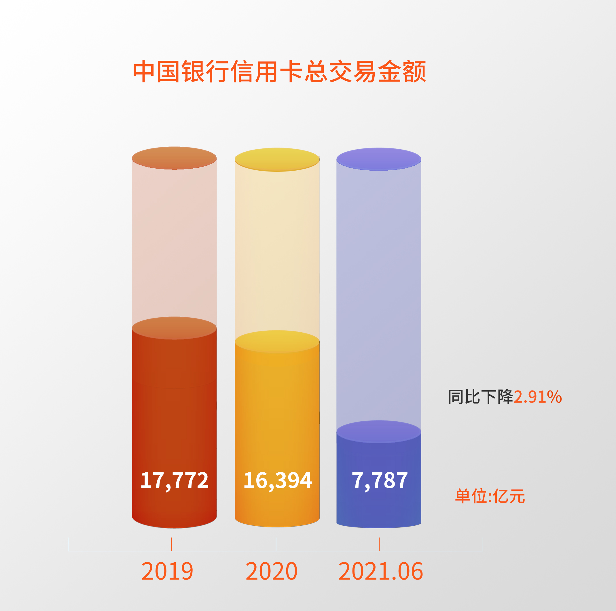 2021年上半年,中国银行信用卡总交易金额7,787.36 亿元,同比下降2.91%。