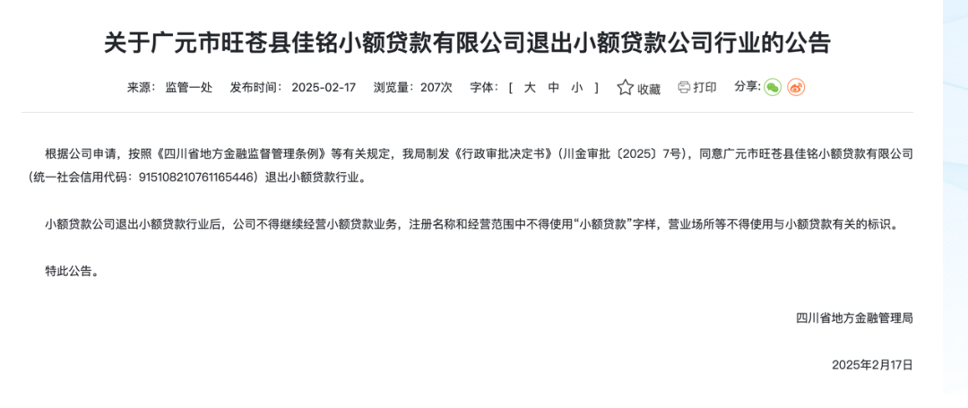 进入2025年,小贷公司退出潮还在持续。作者不完全统计发现,2025年开年至今,江苏、内蒙古、四川、广东、广西等五省金融办已经取消了38家小贷公司的试点经营资格。2月20日,江苏省金融办发布了三家小贷公司终止经营的批复,同意终止南通市海门区苏通科创农村小额贷款有限公司(下称“南通苏通科创小贷”)、南通市通州区恒晟农村小额贷款股份有限公司(下称“南通恒晟小贷”)、仪征市群成农村小额贷款有限公司(下称“仪征群成小贷”)的经营资格。 1月16日,江苏金融办还发布了《关于同意终止南通市海门区大岛农村小额贷款有限公司经营资格的批复》。这意味着,开年来仅江苏一地就有4家小贷公司退出经营。而在2月18日,内蒙古金融办也发布了《关于同意取消10家小额贷款公司经营资格的公告》,取消赤峰市元宝山区永富小额贷款有限责任公司、赤峰市元宝山区融昌小额贷款有限责任公司、锡林浩特市瑞恒小额贷款有限责任公司、伊金霍洛旗圣圆小额贷款有限责任公司、满洲里市林发小额贷款有限责任公司、满洲里市创大小额贷款有限公司、多伦县信邦小额贷款有限责任公司、阿拉善左旗国资小额贷款有限公司、通辽市奈曼旗旺达小额贷款有限公司、通辽市开鲁县晟信小额贷款有限公司10家小额贷款公司经营资格,不得继续从事或者变相从事小额贷款经营业务。 同样,1月10日,内蒙古金融办发布消息,呼和浩特市兴银小额贷款有限责任公司、呼和浩特市兴光小额贷款有限责任公司、呼和浩特市济源小额贷款股份有限公司、呼和浩特市银都小额贷款有限责任公司、呼和浩特市大众小额贷款有限公司、呼和浩特市金蒙小额贷款有限公司、呼和浩特市义特格勒小额贷款有限责任公司、呼和浩特市祥泰小额贷款有限责任公司、呼和浩特市银友小额贷款有限公司、呼和浩特市中网福通小额贷款股份有限公司、呼和浩特市利得小额贷款有限责任公司、呼和浩特市金川开发区金汇小额贷款有限责任公司、呼和浩特市裕景天小额贷款有限责任公司、清水河县金百山小额贷款有限责任公司、包头市利仁小额贷款股份有限公司、包头市汇金小额贷款有限责任公司等16家小额贷款公司符合“失联、空壳”情形,且已由各盟市完成为期30日的名单公示工作,公示期内未收到公示主体陈述、申辩意见。内蒙古金融办同意取消16家小额贷款公司试点资格,要求不得继续从事或者变相从事小额贷款经营业务。取消试点资格的小额贷款公司应当依法依规完成公司名称及经营范围的变更登记,名称和经营范围中不得使用“小额贷款”“小贷”“贷”字样。变更后,公司依法继续承担相应的债权债务及相关法律责任。也就是说,开年来内蒙古金融办已经取消了26家小贷公司的试点资格。无独有偶,2月17日,四川金融办发布公告,同意广元市旺苍县佳铭小额贷款有限公司退出小额贷款行业。 四川金融办表示,小额贷款公司退出小额贷款行业后,公司不得继续经营小额贷款业务,注册名称和经营范围中不得使用“小额贷款”字样,营业场所等不得使用与小额贷款有关的标识。同样,今年1月16日和2月12日,广东金融办发布六则公告,同意潮州市潮安区融信小额贷款股份有限公司、韶关市曲江区宝银小额贷款有限公司等6家小贷公司注销小贷业务试点资格。 而在1月9日,广西金融办也发布了《关于注销北海市威联得小额贷款有限公司小额贷款业务经营许可的批复》,同意终止小额贷款业务经营许可,注销《小额贷款公司经营许可证》。从行业来看,伴随小贷行业监管趋严、竞争加剧等问题,近年来小贷公司持续出清。 监管方面,2025年1月国家金融监督管理总局发布的《小额贷款公司监督管理暂行办法》,进一步细化并规范小额贷款公司经营行为,明确了小额贷款公司业务范围及贷款集中度比例要求,对小贷公司的各类违规行为进行了严格规定。其中,严禁小额贷款公司违规开展“通道”业务,不得出租、出借牌照,为无放贷业务资质的主体提供放贷“通道”等等。 数据上看,截至2024年12月末,全国共有小额贷款公司5257家,贷款余额7533亿元。而在2022年末,全国共有小额贷款公司5958家,小额贷款公司贷款余额9086亿元。也就是说,两年时间里,小贷公司减少701家,贷款余额减少1553亿元。
