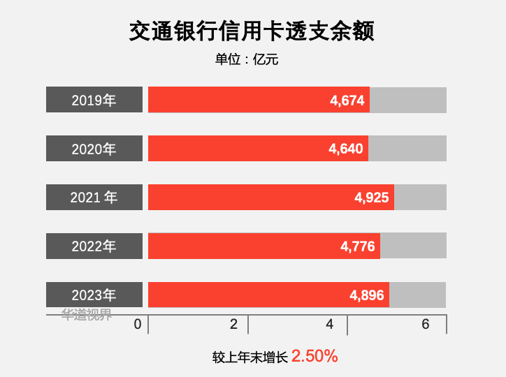 截至2023年末,交通银行信用卡透支余额 4,896.06 亿元,较上年末增长 2.50%;
