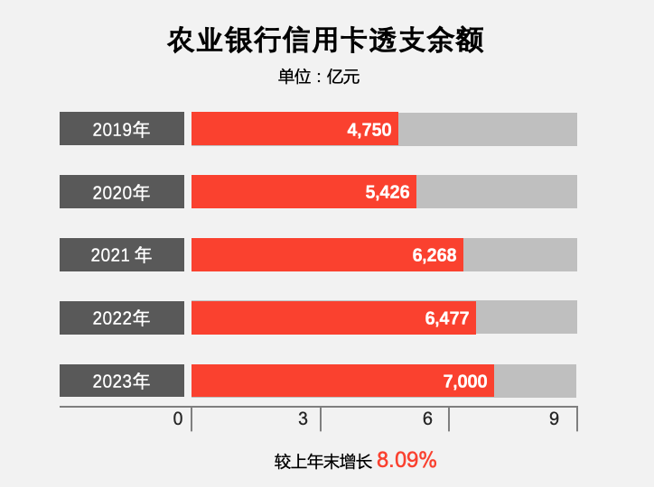 截至2023年末,农业银行信用卡透支余额7,000.31亿元,较上年末增长8.09%;