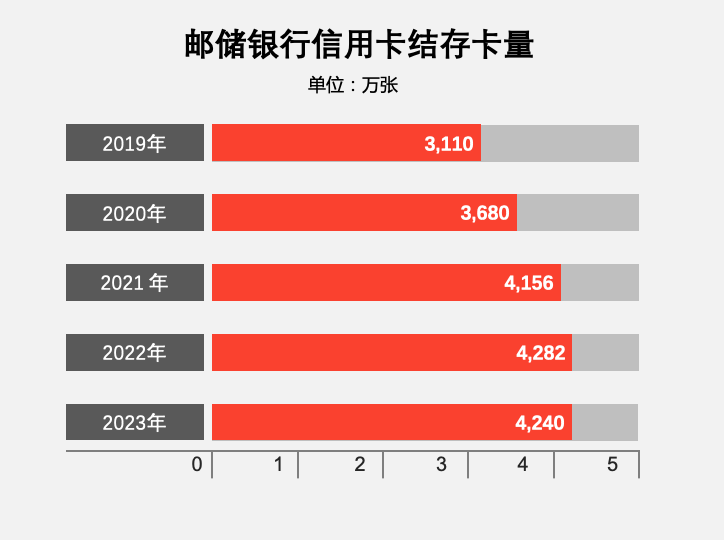截至2023年末,邮储银行信用卡结存卡量达到4,239.94 万张,新增发卡756.88 万张;