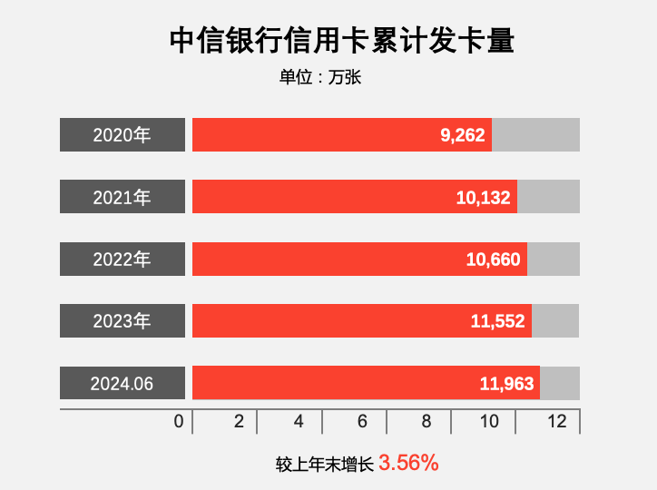 截至2024年6月末,中信银行信用卡累计发卡 11,963.00 万张,较上年末增长3.56%;