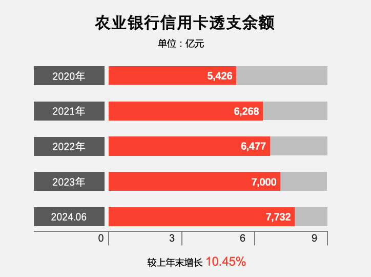 截至 2024年6月末,农业银行信用卡透支余额7,732.14亿元,较上年末增长10.45%;