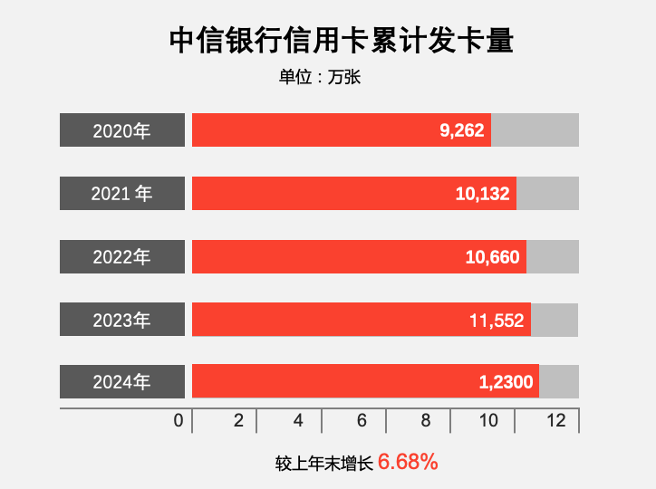 截至2024年末,中信银行累计发卡 1.23 亿张,较上年末增长6.68%;
