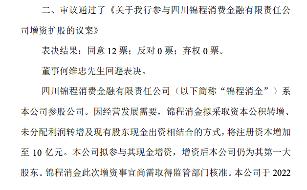 12月24日,成都银行发布公告称,审议通过了《关于我行参与四川锦程消费金融有限责任公司增资扩股的议案》。