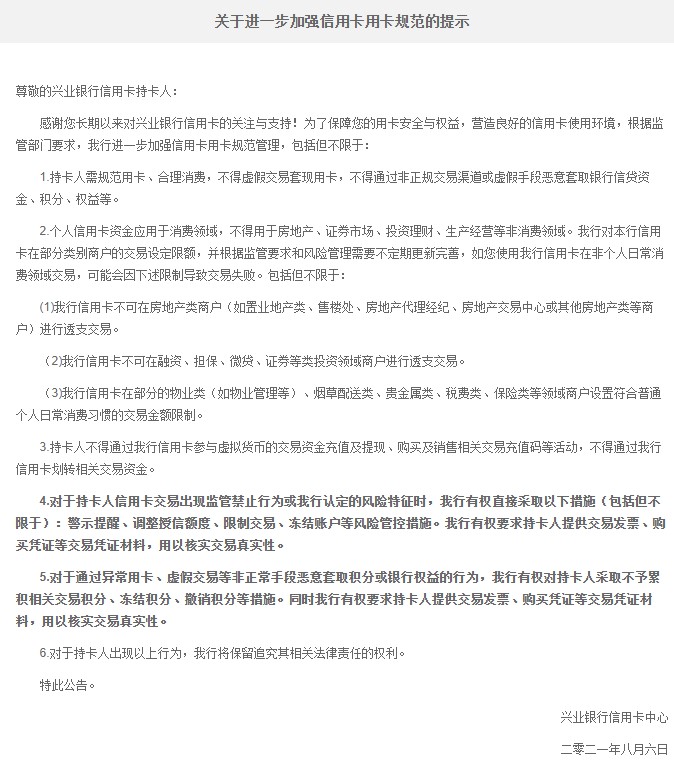 8月6日,兴业银行发布《关于进一步加强信用卡用卡规范的提示》,提示称根据监管部门要求,将进一步加强信用卡用卡规范管理。