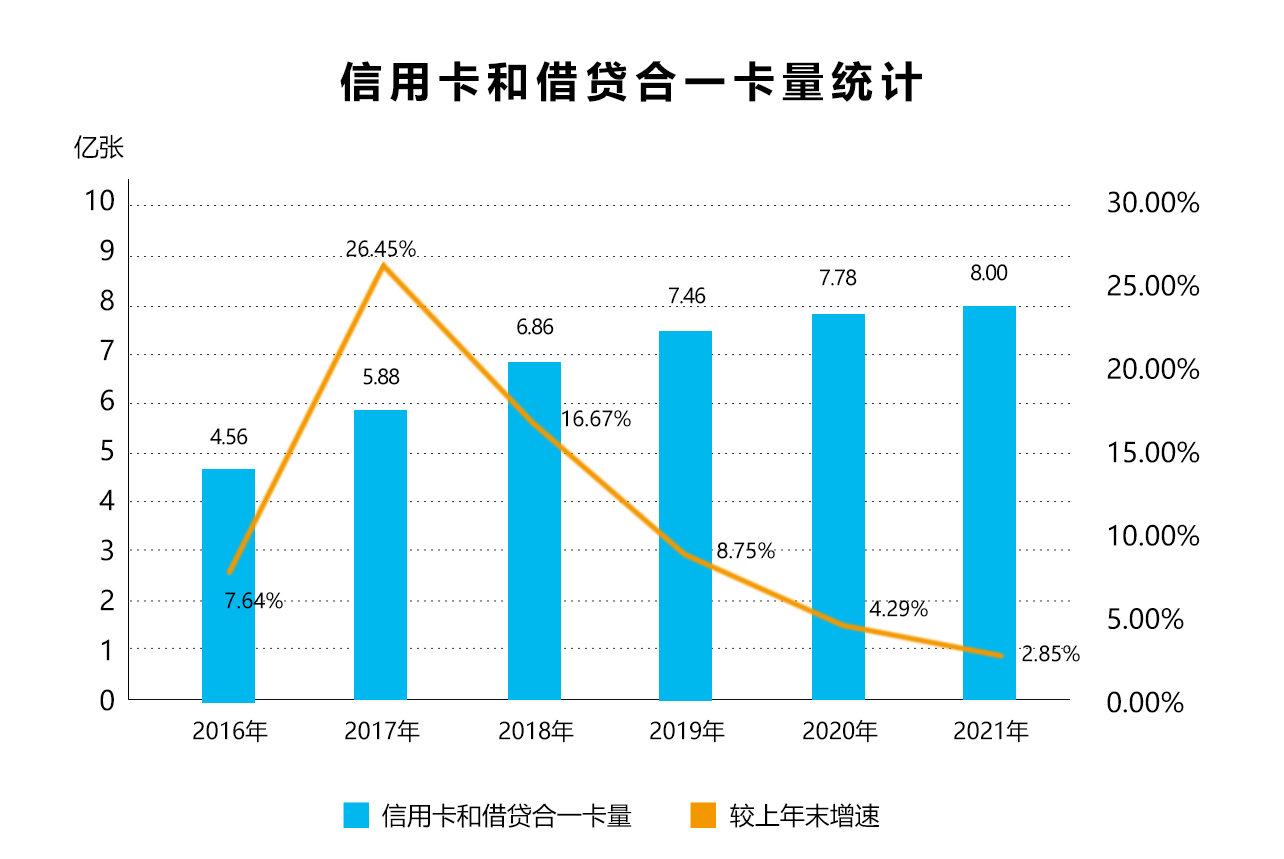 4月2日,中国人民银行公布了《2021年支付体系运行总体情况》,根据文件显示,截至2021年末,我国信用卡和借贷合一卡8.00亿张,较上年末增长 2.85%。人均持有银行卡6.55张,其中,人均持有信用卡和借贷合一卡0.57张。