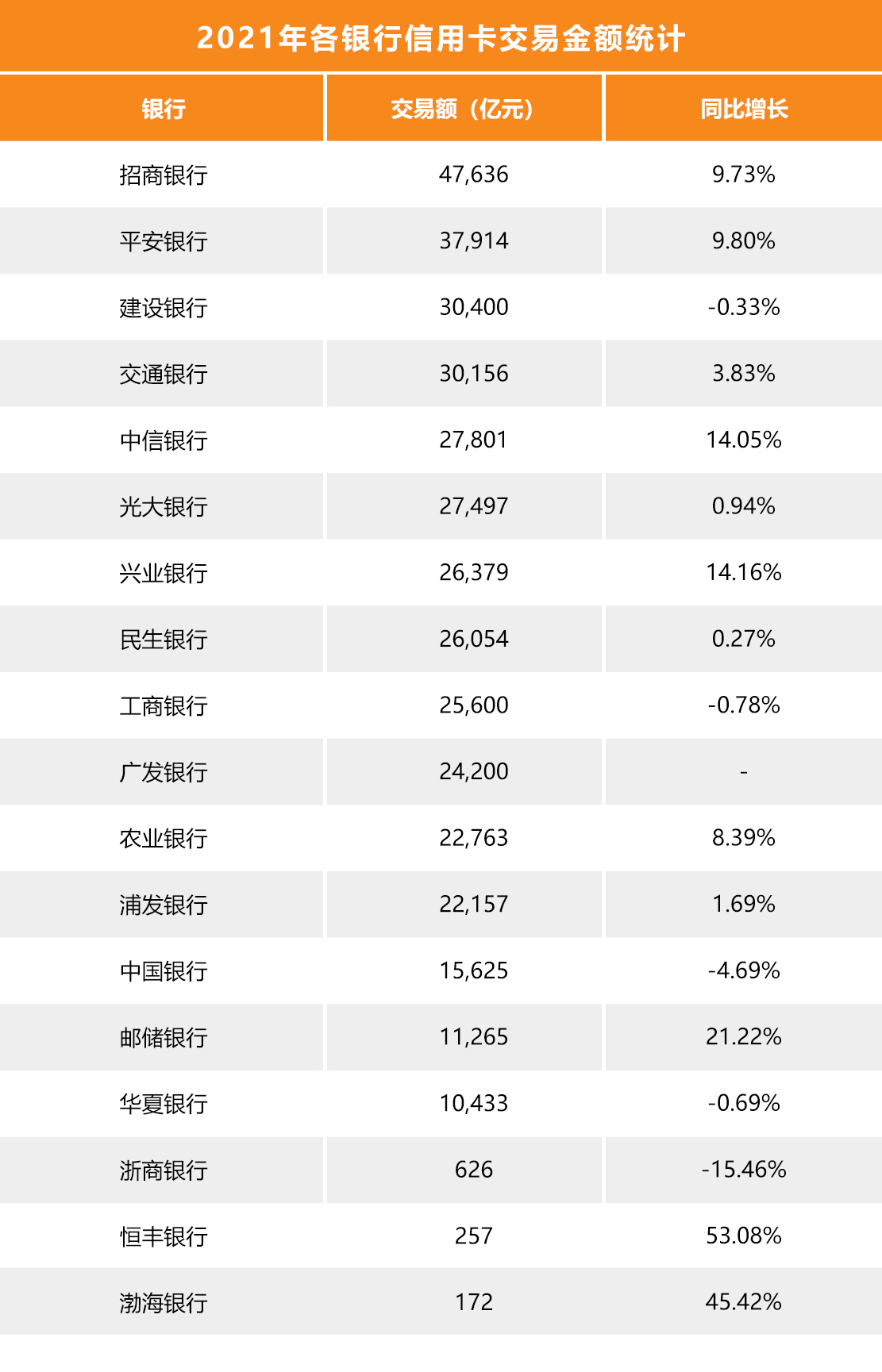 在这18家大型银行当中,有5家银行信用卡消费金额较上年出现下降,12家银行实现正向增长。其中,增幅最高的为恒丰银行,同比增长53.08%,是唯一一家增幅超过50%的银行,其次为渤海银行,增幅为45.42%。