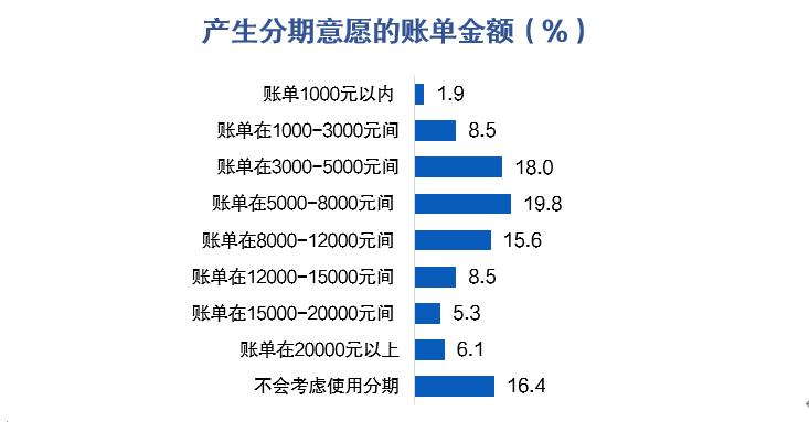 当客户的账单金额在5000-8000元之间时,有分期还款倾向的受访者比例最高,约为20%。与之比例相近的是账单金额在3000-5000元之间(18%)。
