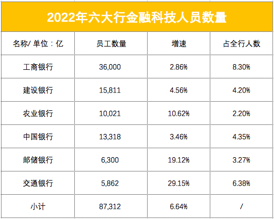 2022年六大行金融科技总人数达到87,312人,同比增长6.64%,其中工行最多为3.6万人,建行、农行、中行人数均超过1万,其中农行首次突破万人关卡,至今连续两年增速分别为12.45%和10.62%。