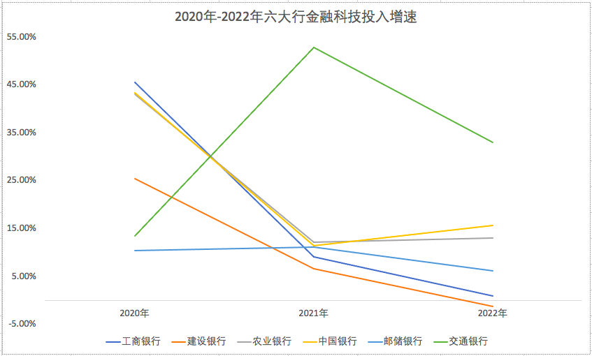 农行和中行虽然在总投入金额不及工建行,但在2020至2022年均保持两位数稳健增长。交行金融科技板块的投入更是实现跨越式增长,从2019年的50亿到现在的116亿元,2020年至2022年同比增长分别为13.46%、52.87%、32.93%,实现反超邮储银行。