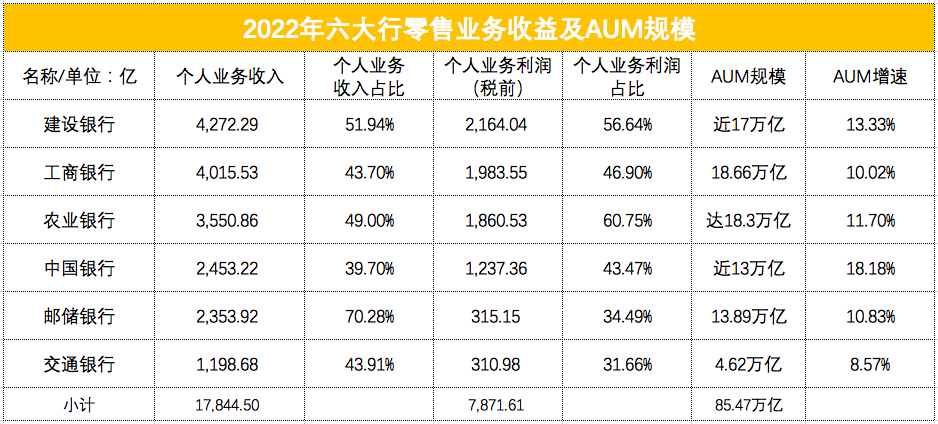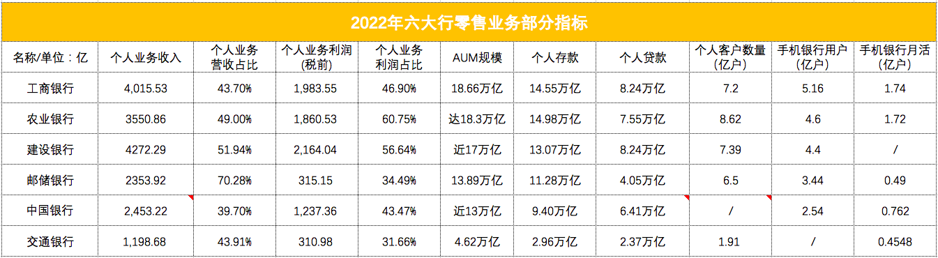 我们从以下几个方面来看下2022年六大行零售业务的情况