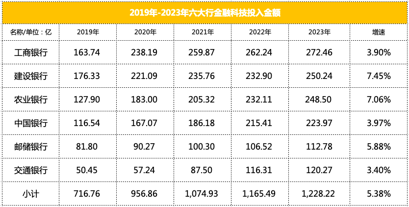 2019年到2023年,六大行金融科技的总投入分别为716.76亿、956.86亿、1,074.93亿、1,165.49亿元和1,228.22亿元,呈逐年上升的趋势,但增速逐年下降,截至2023年,六大行金融科技投入增速已放缓至5.38%。