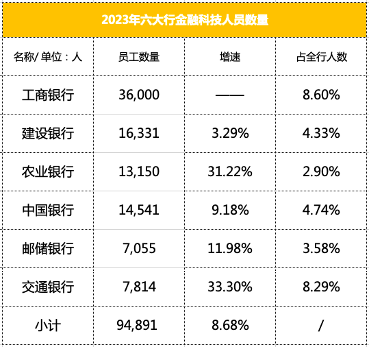2023年,六大行金融科技人才达到94,891人,同比增长8.68%,其中工行人数仍为最多达到36,000人,与去年持平,占总人数比例最高至8.6%;