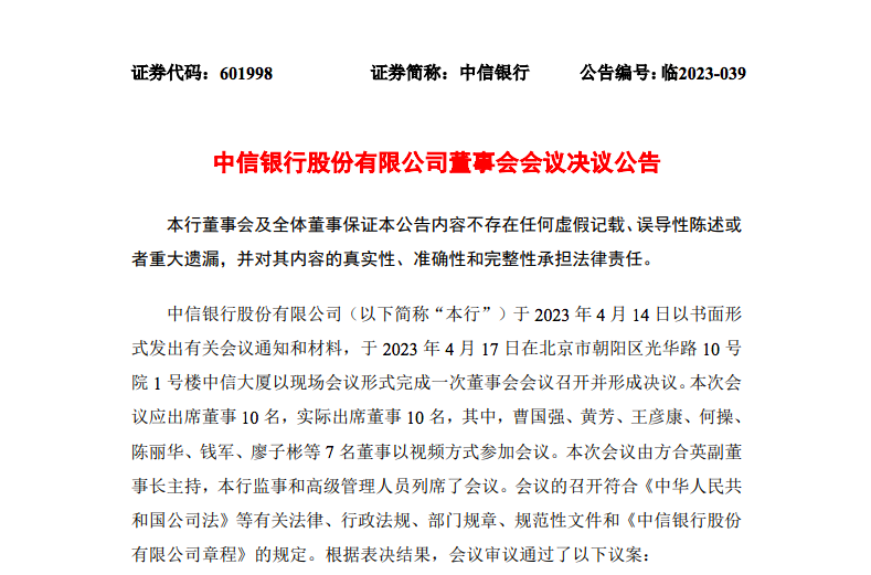 公告称,朱鹤新先生的辞任自2023 年4月17日起生效。朱鹤新先生辞任后不在中信银行及该行控股子公司担任任何职务。