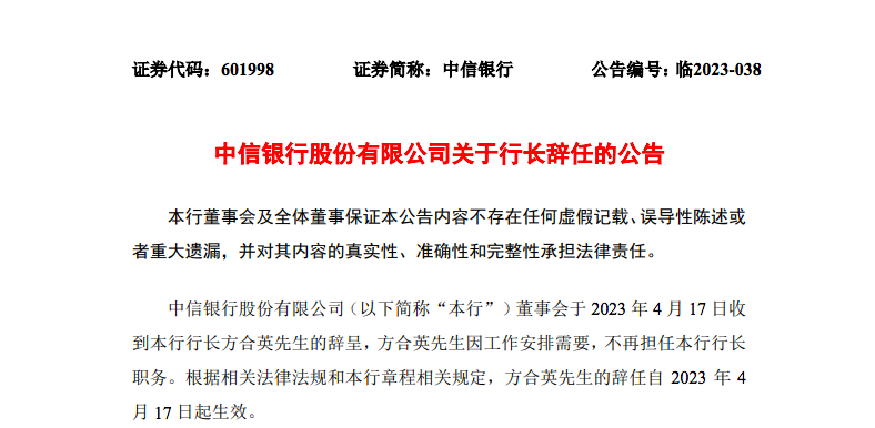 同日,行长方合英先生因工作安排需要,不再担任该行行长职务。根据相关法律法规和中信银行章程相关规定,方合英先生的辞任自2023年4月17日起生效。