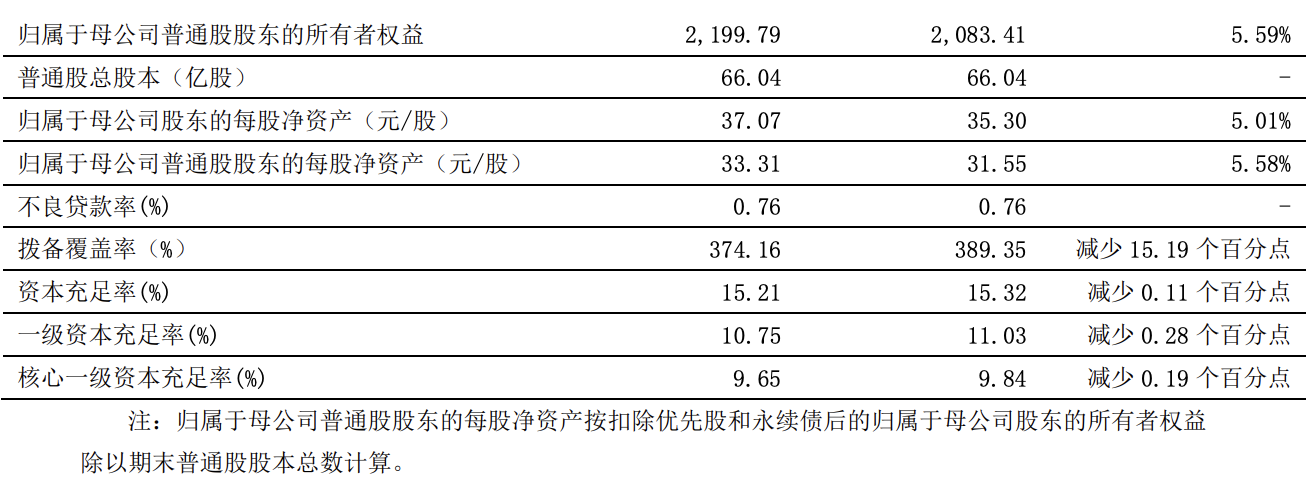 业绩快报显示,截至2025年6月末,宁波银行不良贷款率0.76%,环比持平;拨备覆盖率374.16%,环比提升3.62个百分点;资本充足率为15.21%,环比提升0.27个百分点;核心一级资本充足率为9.65%,环比提升0.33个百分点。