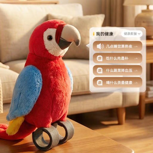 对银发族,AI玩具则是提供方言交互、健康提醒与隔空关怀的数字化陪伴。如京东“唠唠鹦”支持天津话、四川话、广东话等多种主流方言识别,在基础配置上默认慢语速(较普通智能设备慢约20%),采用老年机的大音量输出模式,内置戏曲、评书等适老内容。该产品还联动京东健康服务,可推送服药提醒并同步药品禁忌知识,支持一键呼救。其亲情日志同步功能让子女能够远程掌握老人每日状态,实现“隔空陪伴”。