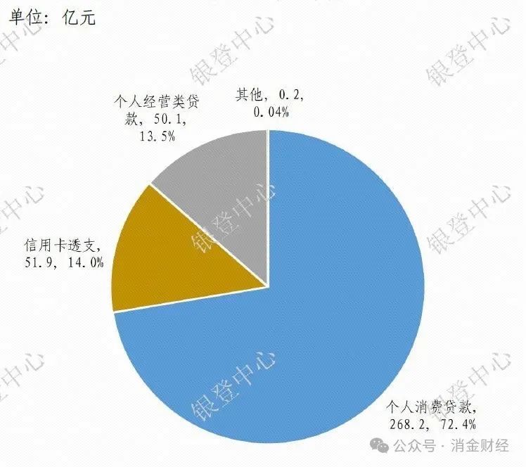 ,个人消费贷款以72.4%的占比(268.2亿元)占据绝对主导,信用卡透支、个人经营贷分别占14%和13.5%