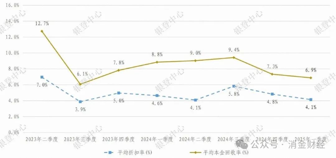 银登中心:批量个人业务平均折扣率及平均本金回收率走势(2023年二季度—2025年一季度)