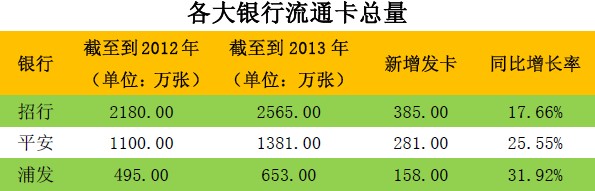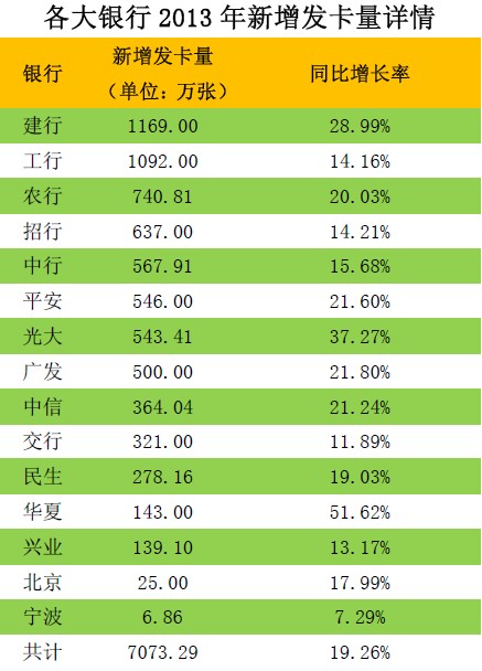 表1:各大银行2013年新增发卡量汇总(降序排列)