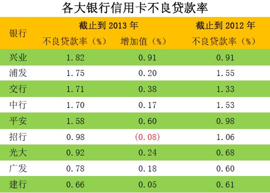 表6:各大银行信用卡不良贷款率详情(2013年不良率降序排列)