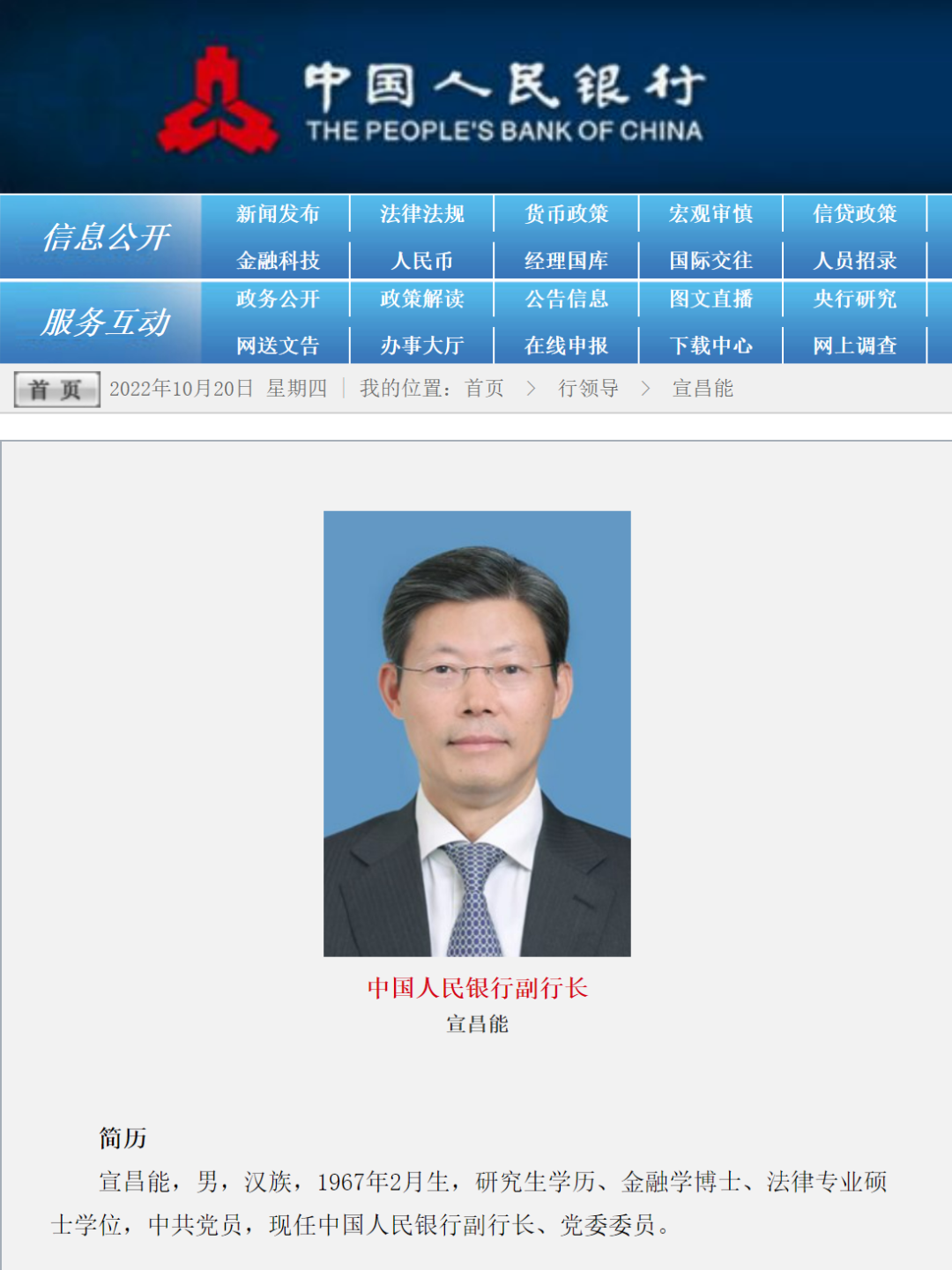 10月20日,据中国人民银行官网领导栏目信息显示,宣昌能任中国人民银行副行长、党委委员。